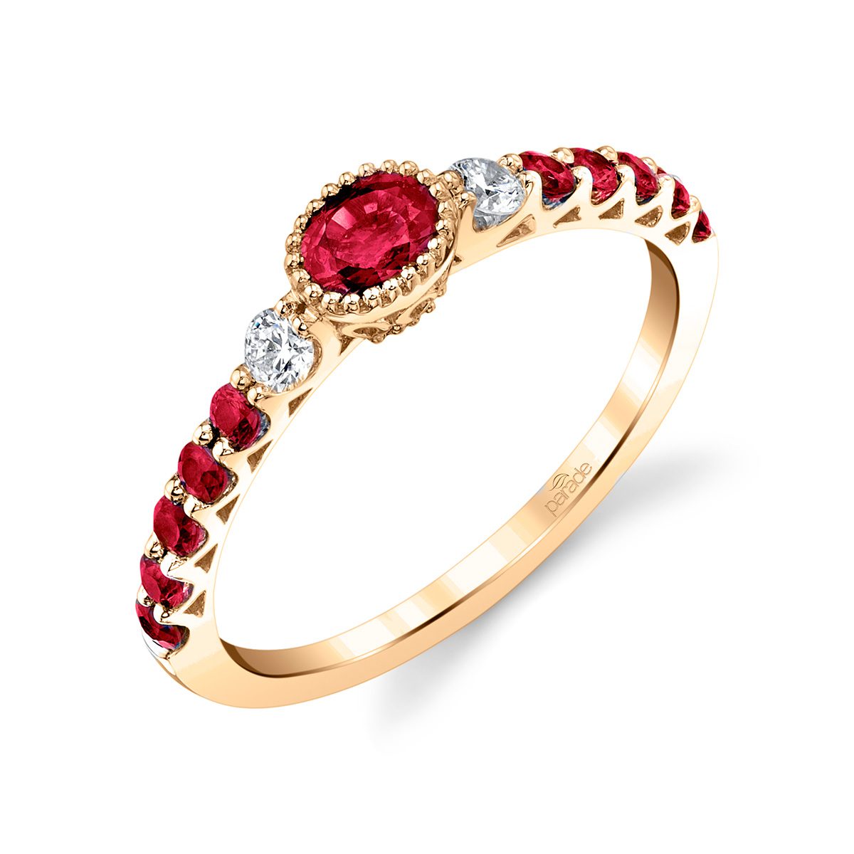 Bright red rubies and brilliant white diamonds set in ornate 18K gold shine in this design from the Parade in Color Collection.