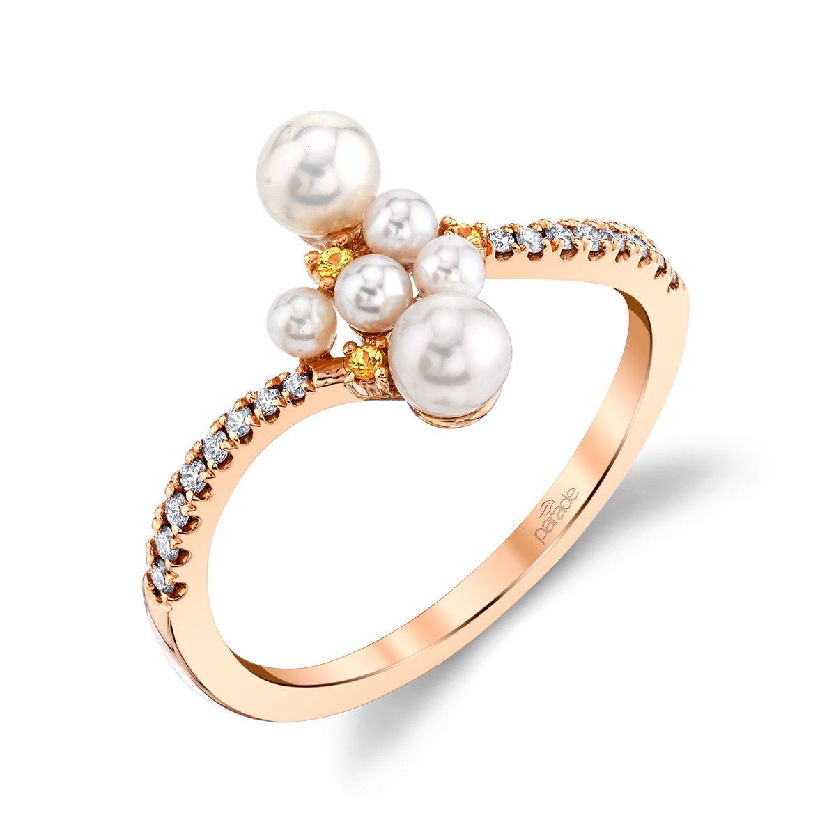 A whimsical cluster of pearls and bright yellow sapphires glow atop a band of sparkling white diamonds.